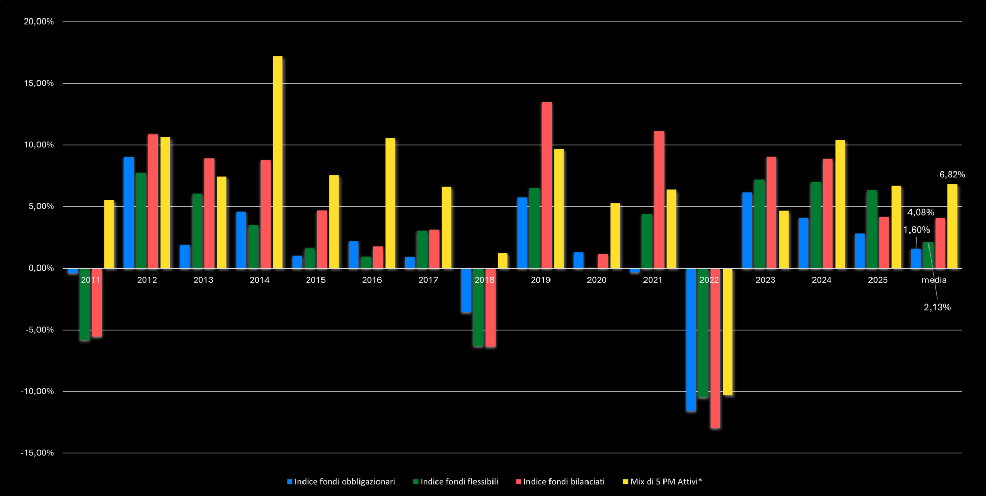 * PM Dragon: 20% – PM Global Growth: 20% – PM Multiasset: 20% – PM Market Alert Master Bilanciato: 20% – PM Market Alert Bond: 20%